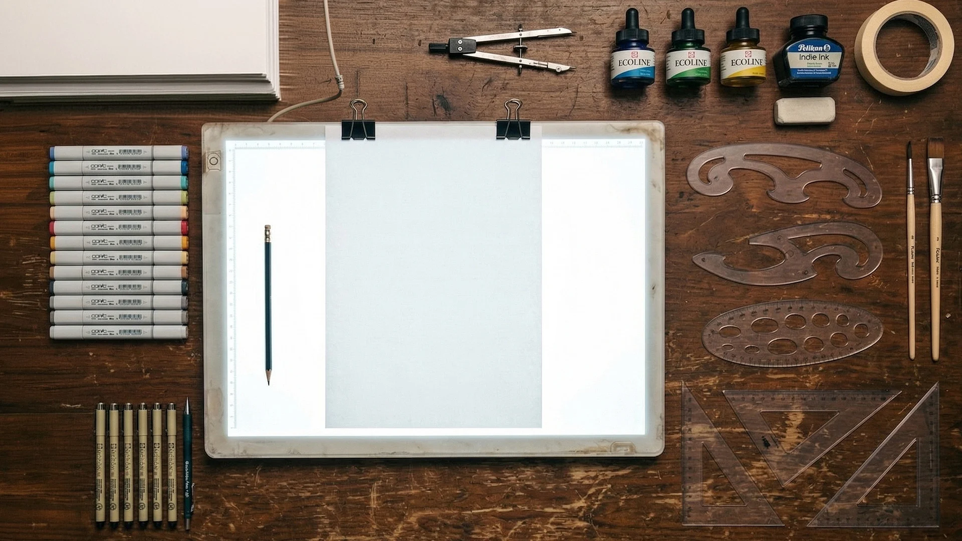 Il tavolo luminoso è lo strumento tuttofare: una scatola con piano in vetro retroilluminato, usata per ricalcare schizzi senza toccare il foglio definitivo, correggere proporzioni, sovrapporre fogli di carta da lucido per spostare elementi o creare “livelli” analogici, molto prima che Photoshop li inventi con un clic. D’inverno ha anche un bonus inaspettato: la lampada interna scalda il vetro, e appoggiarvi le braccia nelle giornate fredde è un piccolo lusso artigiano.