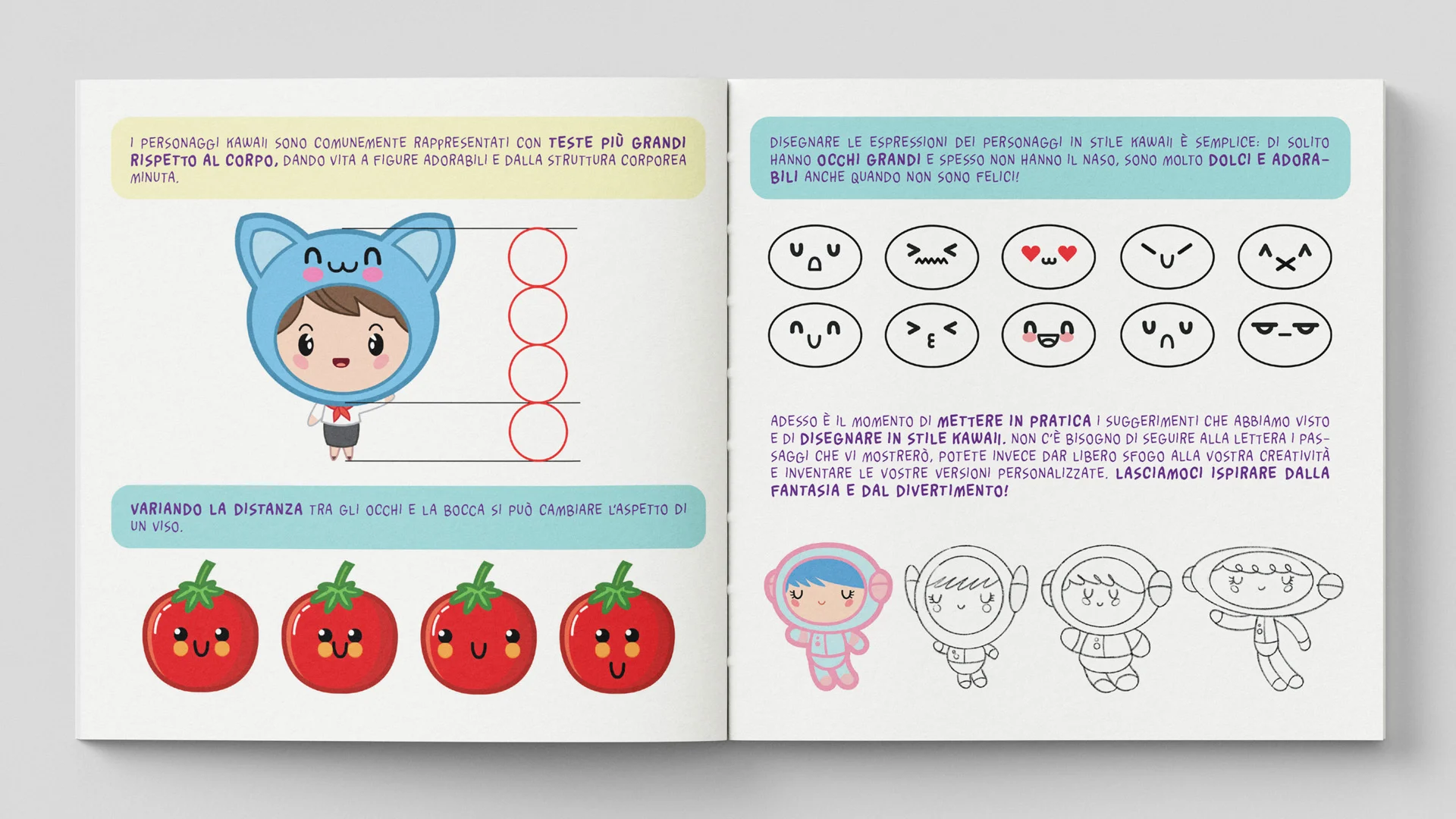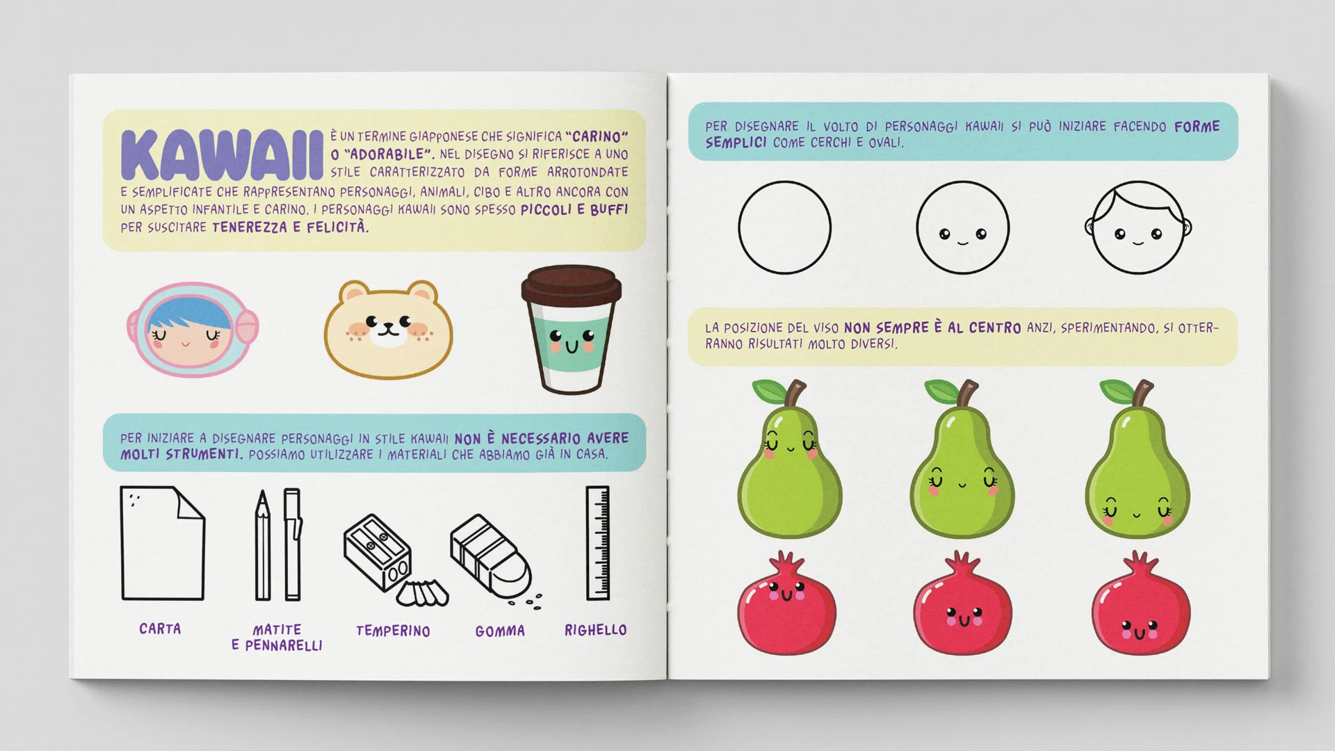 Un libro che insegna a disegnare passo dopo passo disegni carini in stile kawaii.